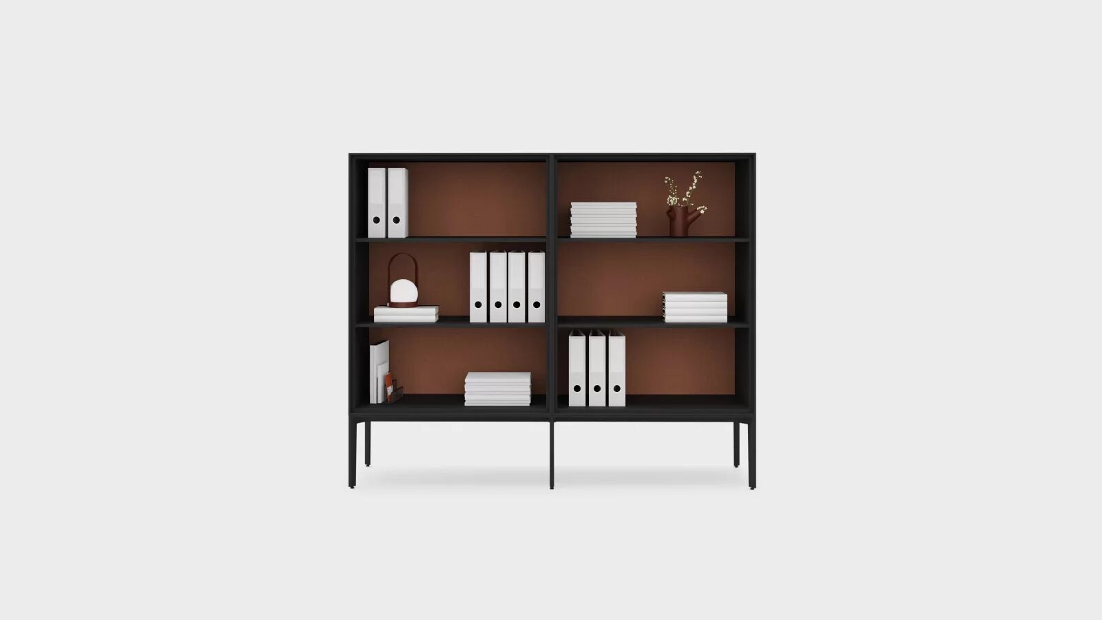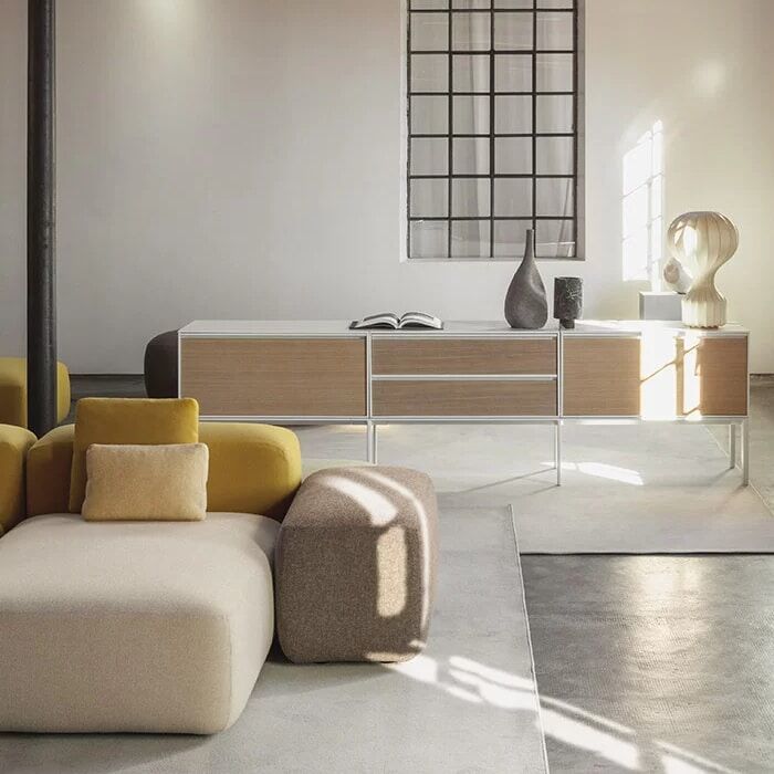 Documents, books and objects. Memories and visions of the future. Any period of design can find a space in the ADD system storage units. In line with the inventive creativity of seating, metal units can be arranged and combined with tables in a versatile way, thus creating work stations. Double-sided, open or closed with drawers and doors, these furniture units easily furnish the centre of a room and its walls. The same flexibility can be found with finishes and colours that enhance monochrome rigour or add contrasting effects with the different shades of seating and cushions.