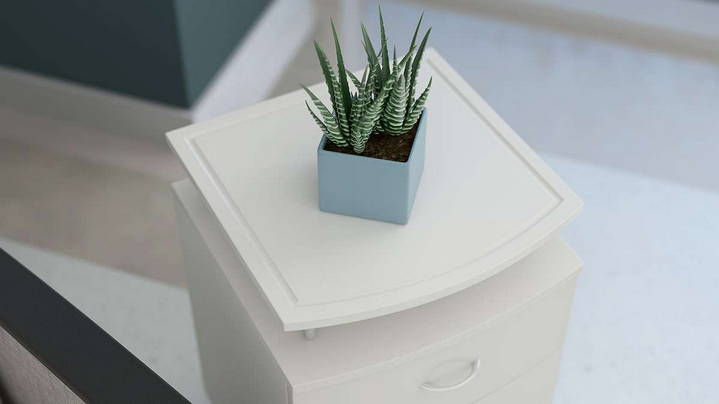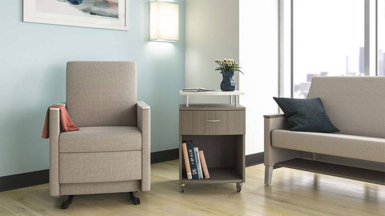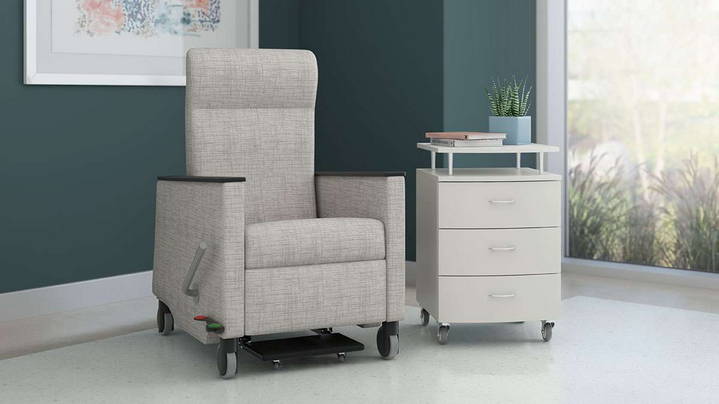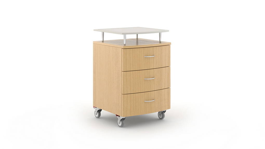 Senso is a modern collection of luxurious veneer and laminate patient room casegoods featuring floating tops on bedside cabinets and dressers for a light, contemporary setting. Other high design features are a bow front design, tops in veneer, HPL, 3DL, or solid surface selections, drawer and door fronts in decorative veneer or contrasting solid white, and wood feet for a modern style or casters for mobility. View the image pack to see some examples of the variety of products and options available with Senso.