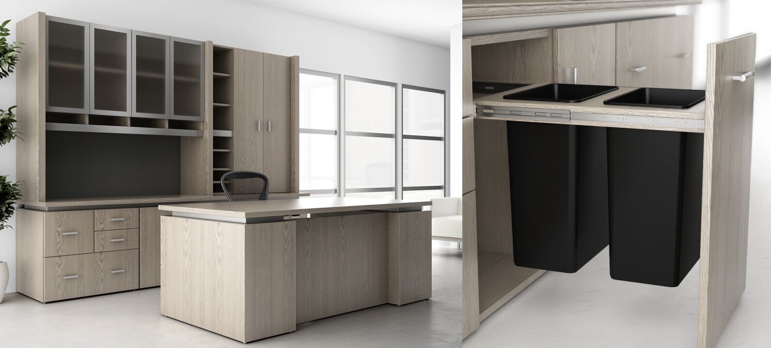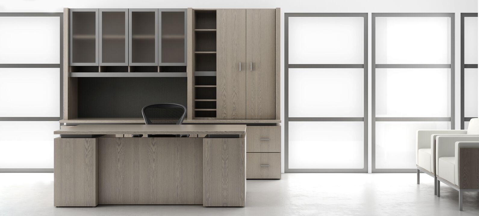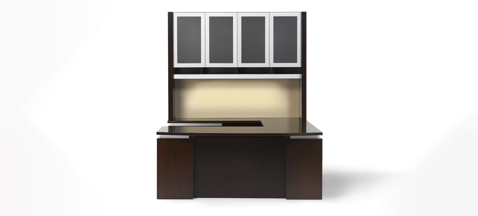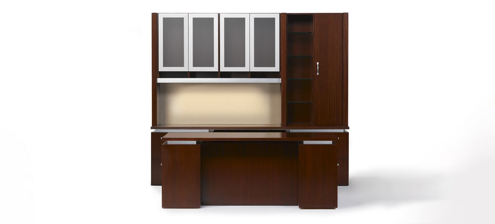 Clean, crisp lines paired with glass, satin aluminum and wood, create a classic combination for high performance, aesthetically pleasing casegoods brought to the industry in the Cascade Series. Select from a broad array of options for configurations with many specialty components. The functionality of the Cascade Series maintains a pleasing modern aesthetic while providing space for efficient uncluttered workspaces; a flexible solution to fulfill the requirements of Entry Level Offices to Upper Management Suites.