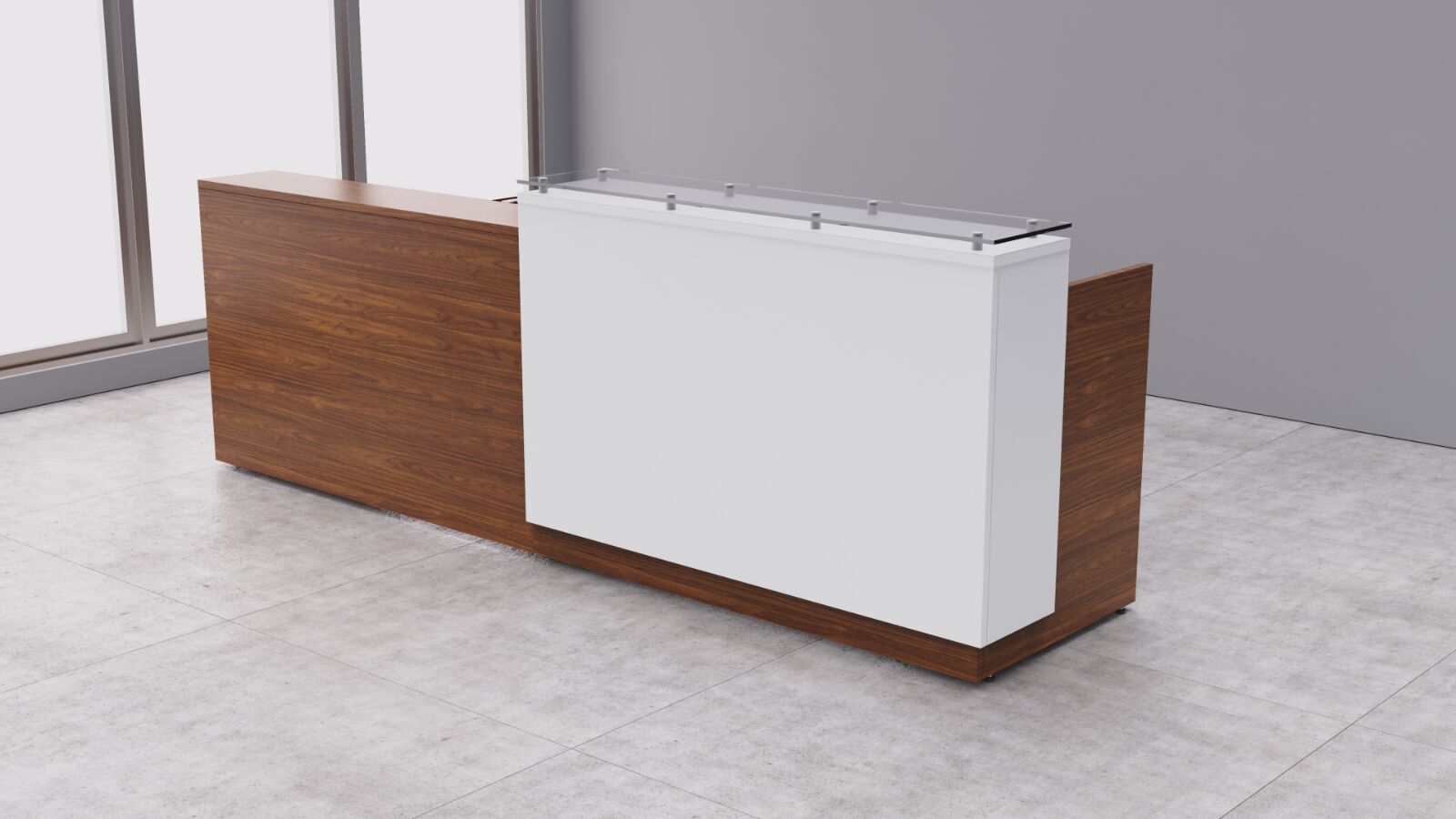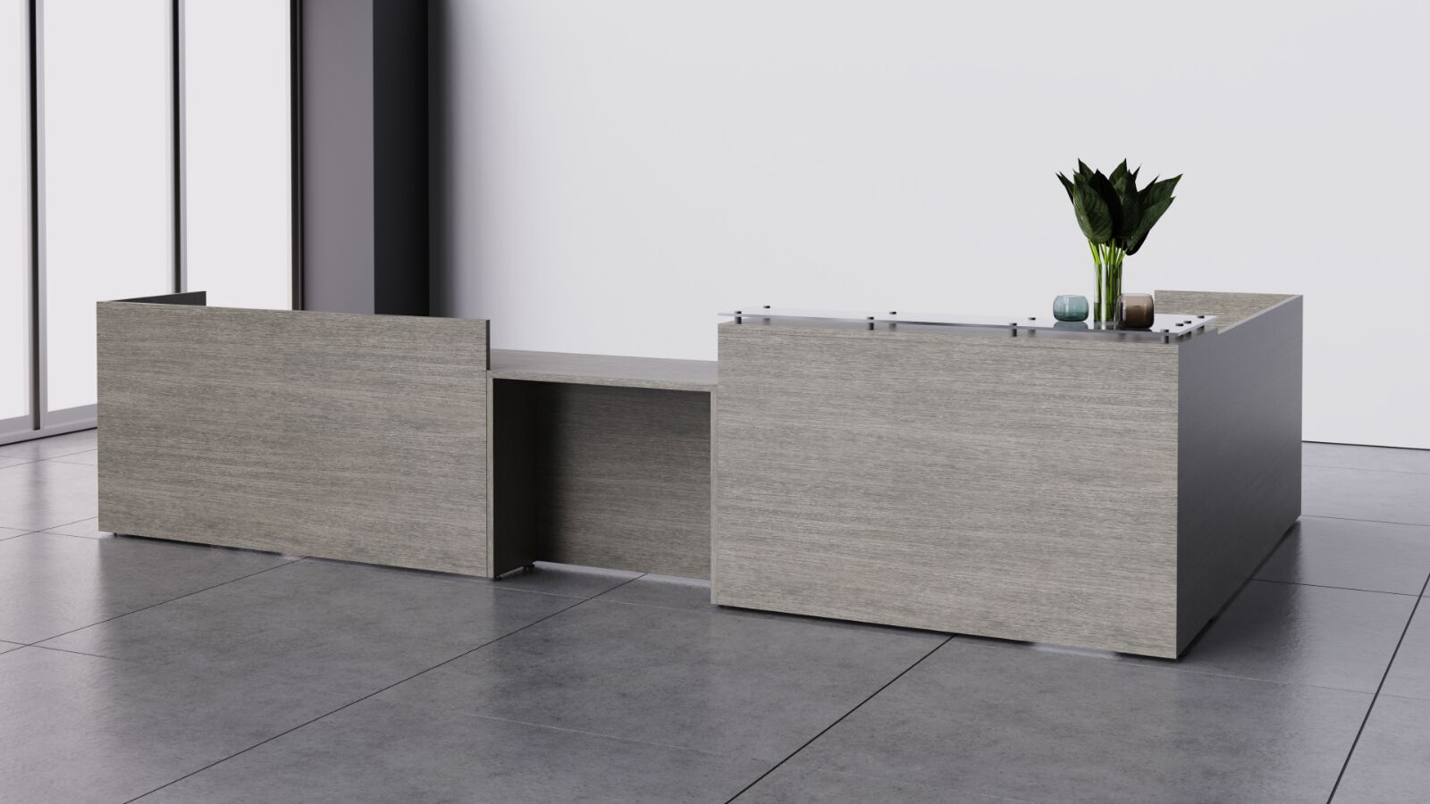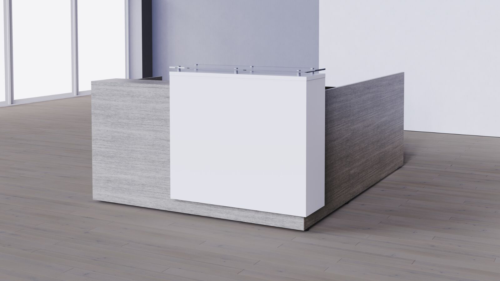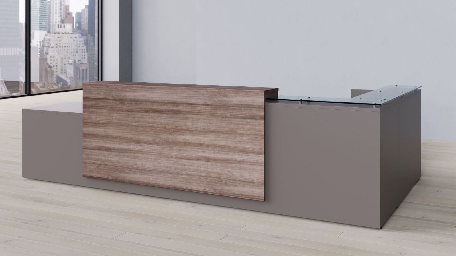 Three H reception boasts an array of surface materials, finishes, fabrics & glass; and also the ability to customize configurations to suit any space.