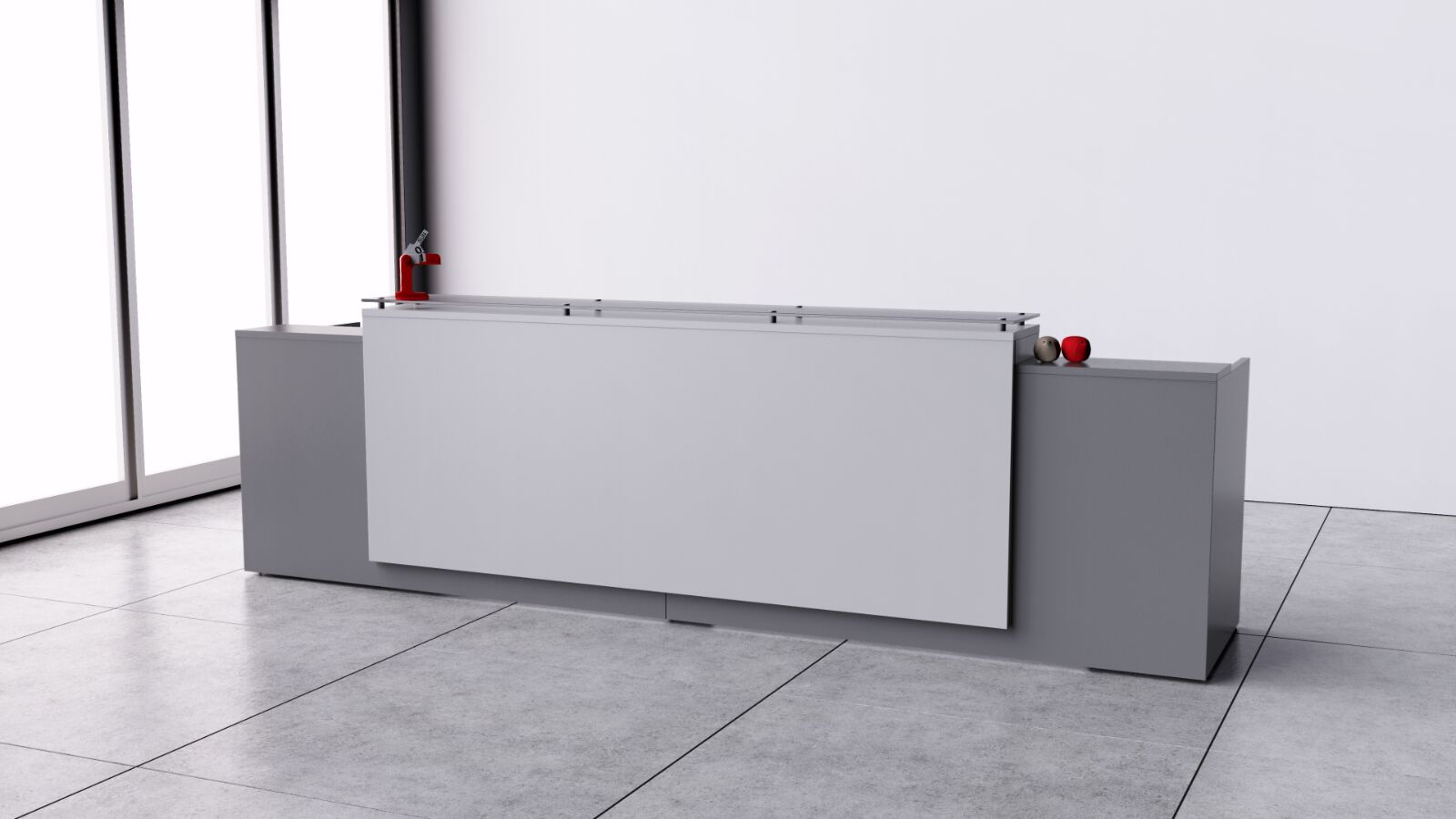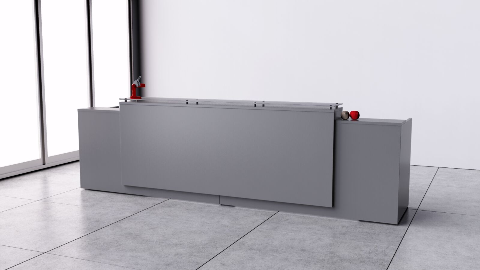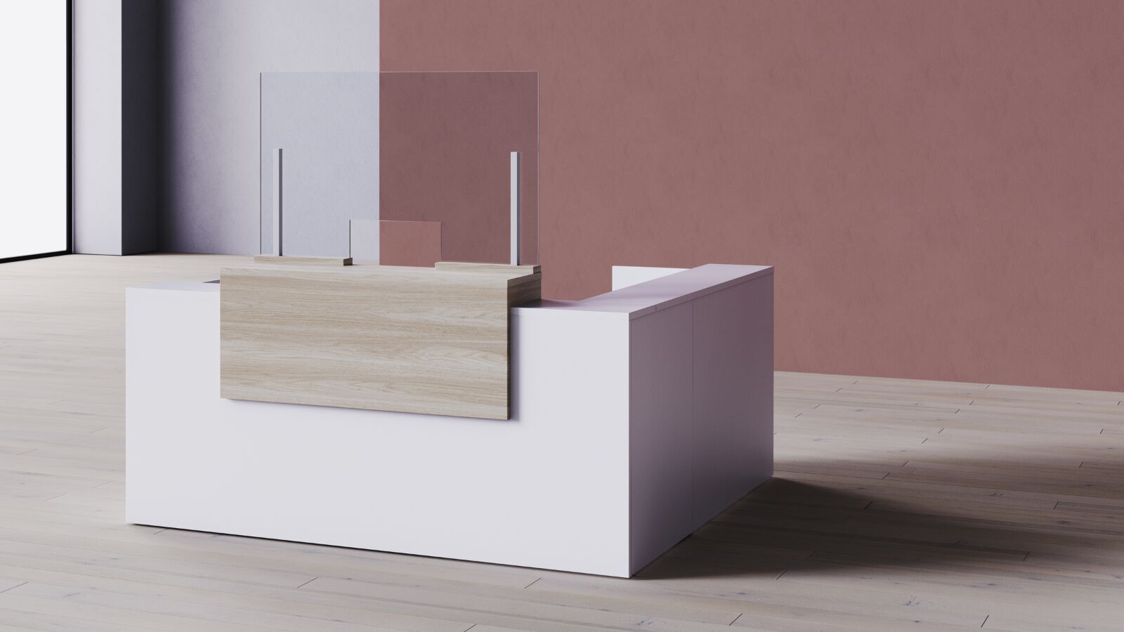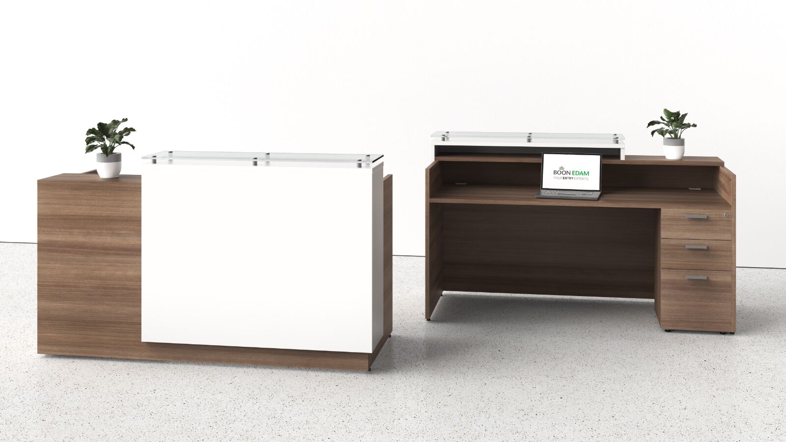 Three H reception boasts an array of surface materials, finishes, fabrics & glass; and also the ability to customize configurations to suit any space.