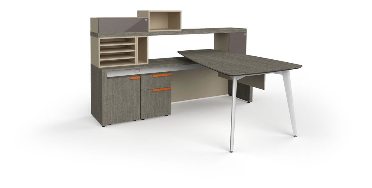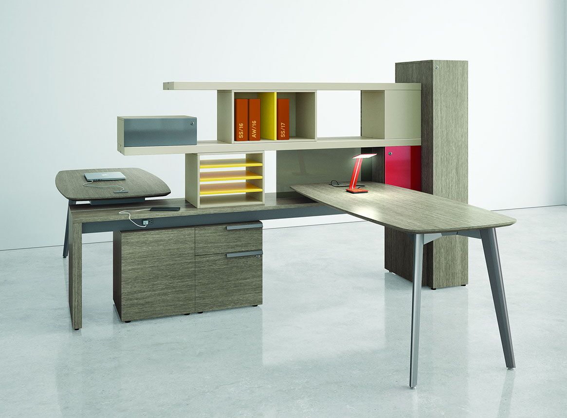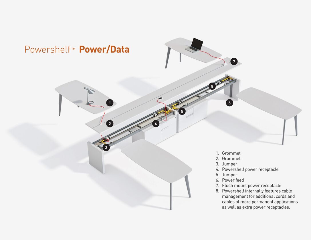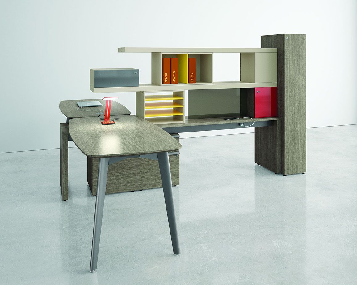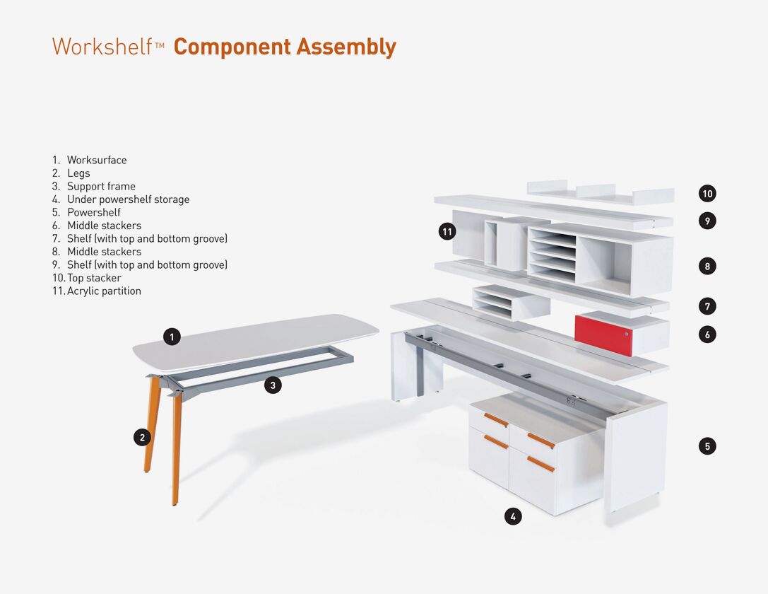 The design team extended the notion of working with a primary power-beam by building creative storage and open access components within additional shelving above the core beam. The stacking and layering of Workshelf individual and shared storage modules within the two-inch shelves is a signature element of the product line. The cantilever and open asymmetrical shelves offer freedom to place items and objects in an orderly but creative fashion. Workshelf storage includes: cabinetry with lock options is a personal spot to secure laptops, phones, tablets etc.; storage cabinets can be arranged in a shared fashion with the option of four new colorful acrylic fascia; book and binder slots offer arms reach flexibility; paper trays are a nod to the in-out baskets of traditional offices and smoked acrylic privacy dividers offer a handsome design touch.