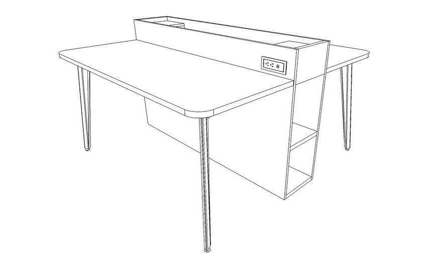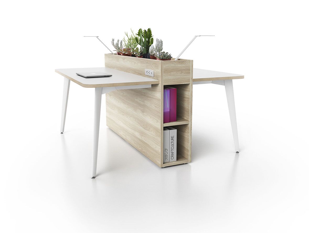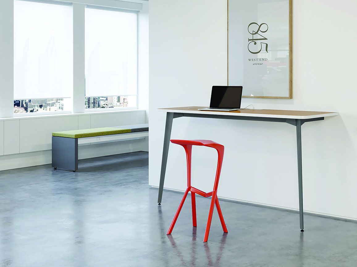 Workstops features a solid wood leg (in 10 wood stains and 3 solid colors), steel frame (white and graphite) and curved, organic surface shapes designed by Mark Müller