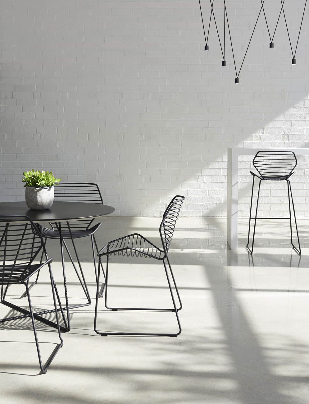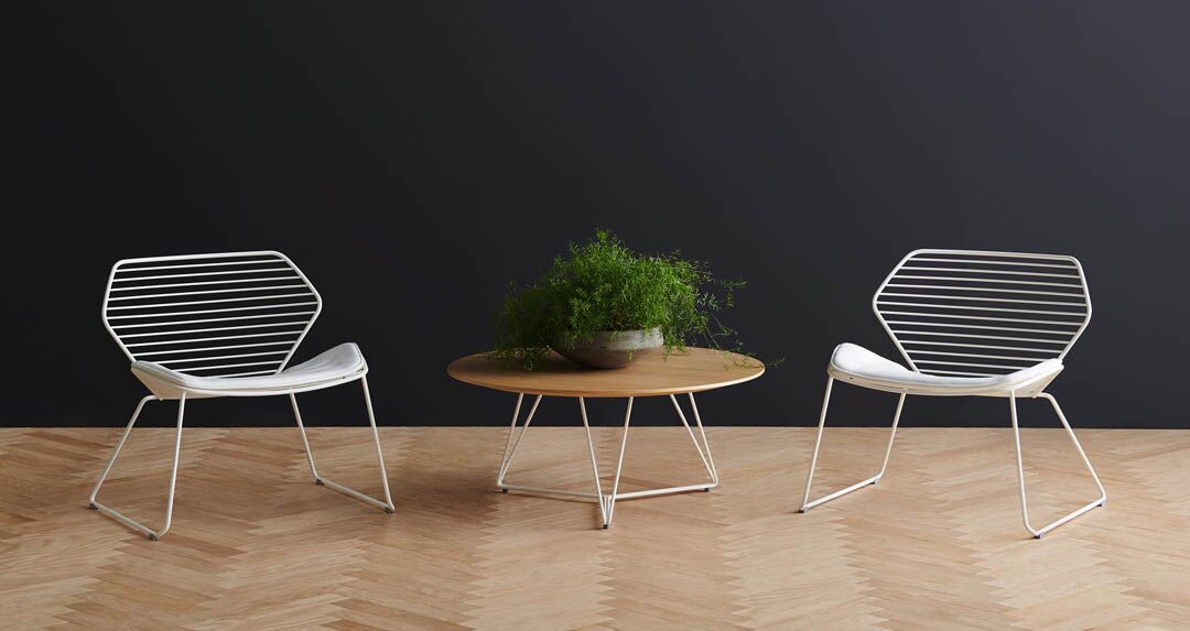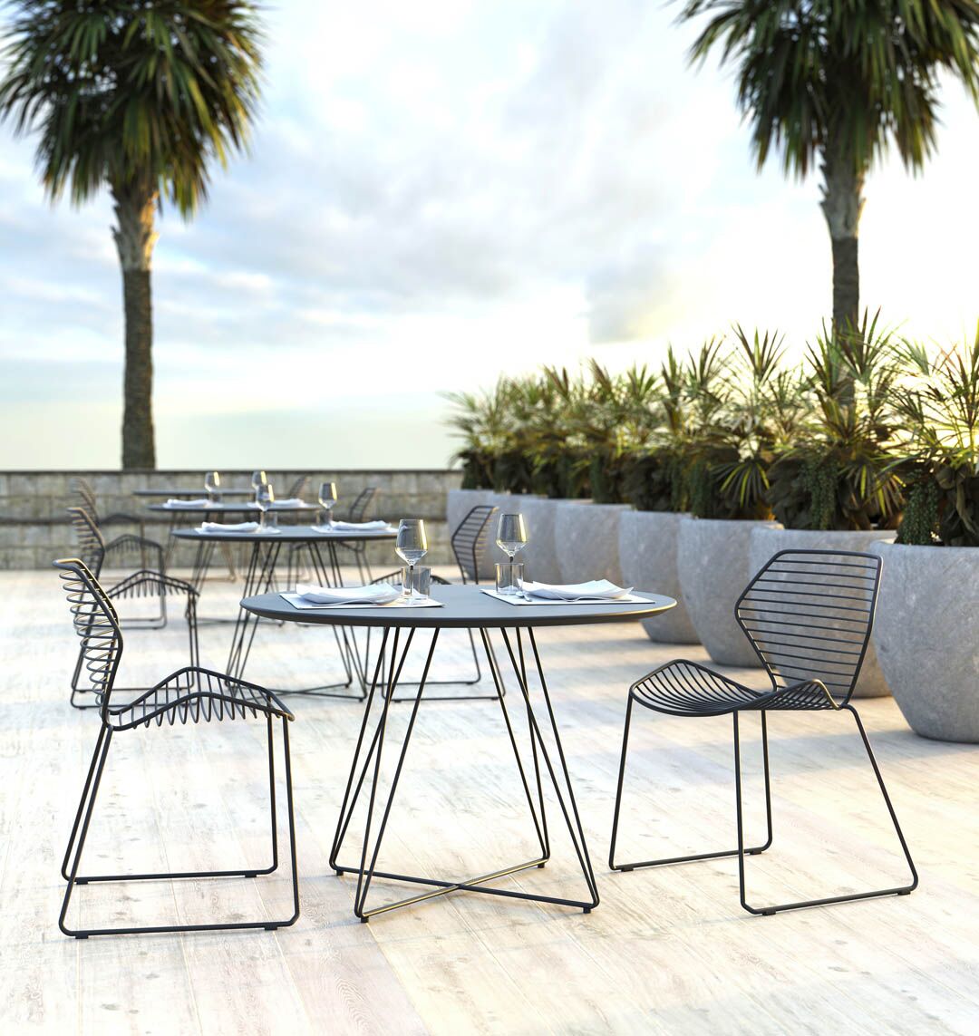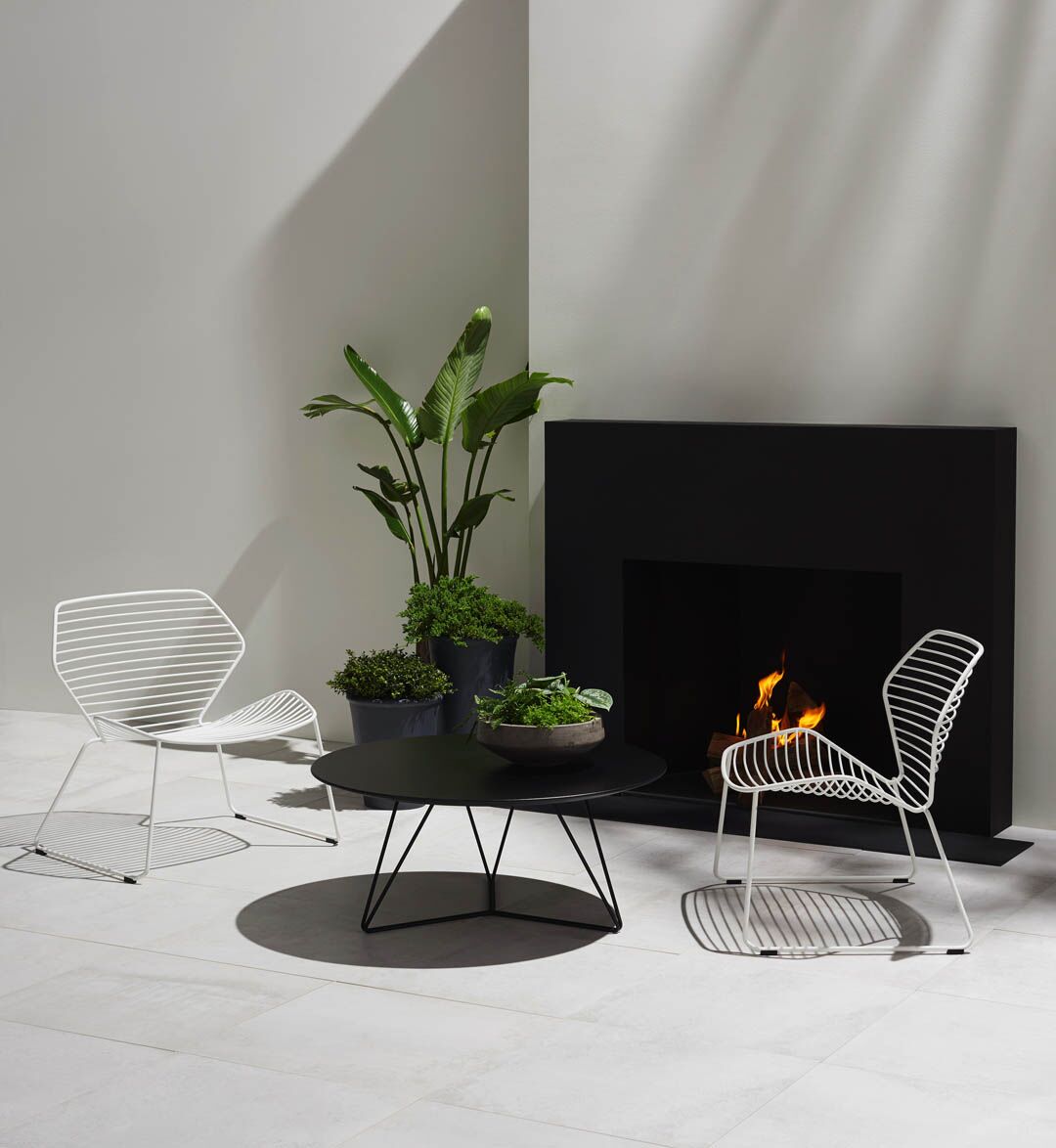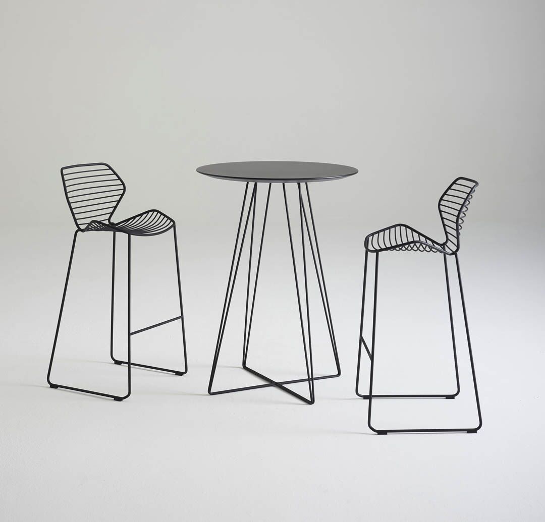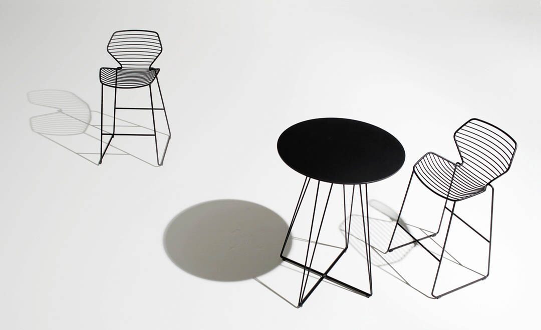 Indoor/Outdoor collection constructed of solid steel rods designed to complement the Ginkgo Wire chair