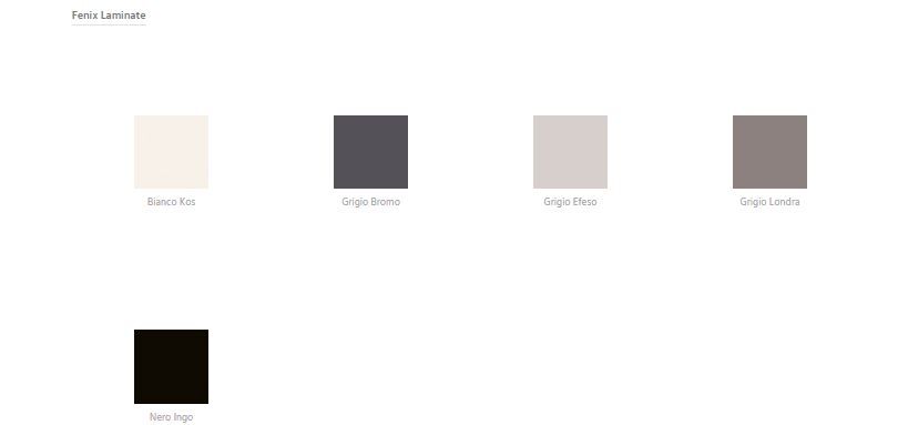 Indoor top options include: Oak veneer, Walnut veneer, Fenix laminates, and white acrylic