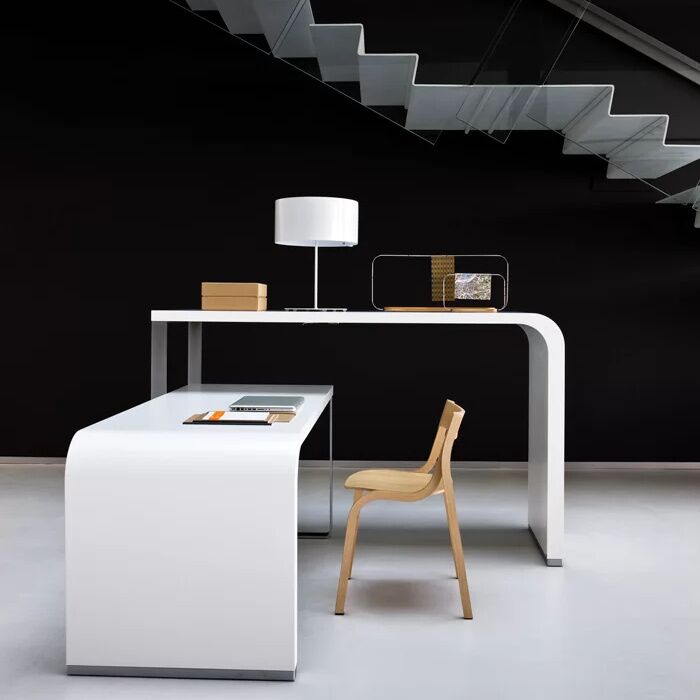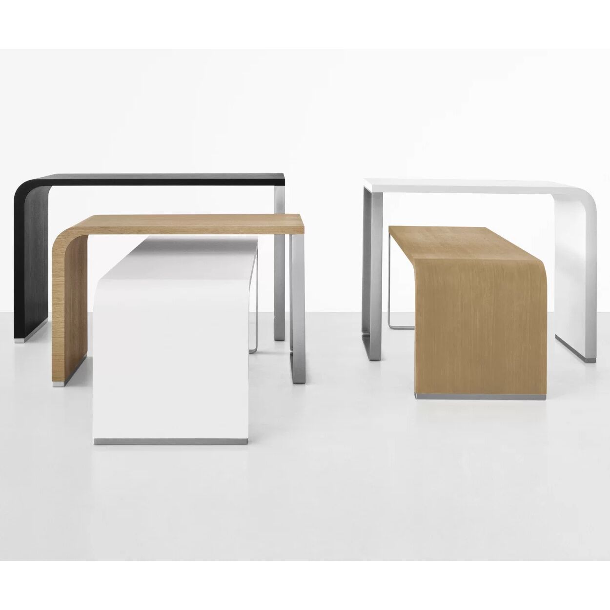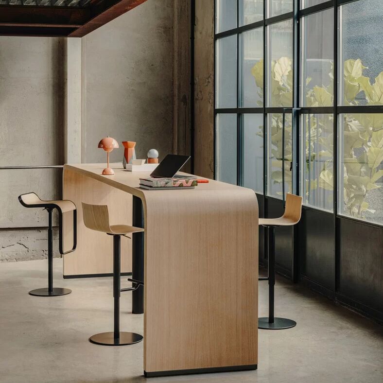 Two worlds, two “moments” come together just like in the brunch tradition. On one side, a wood top that descends in a curve to the floor and gently changes thickness, and on the other, a rigorous metal base. With its highly original asymmetrical effect, this table can be freely arranged, with heights intersecting and opening up in the directions of a star.