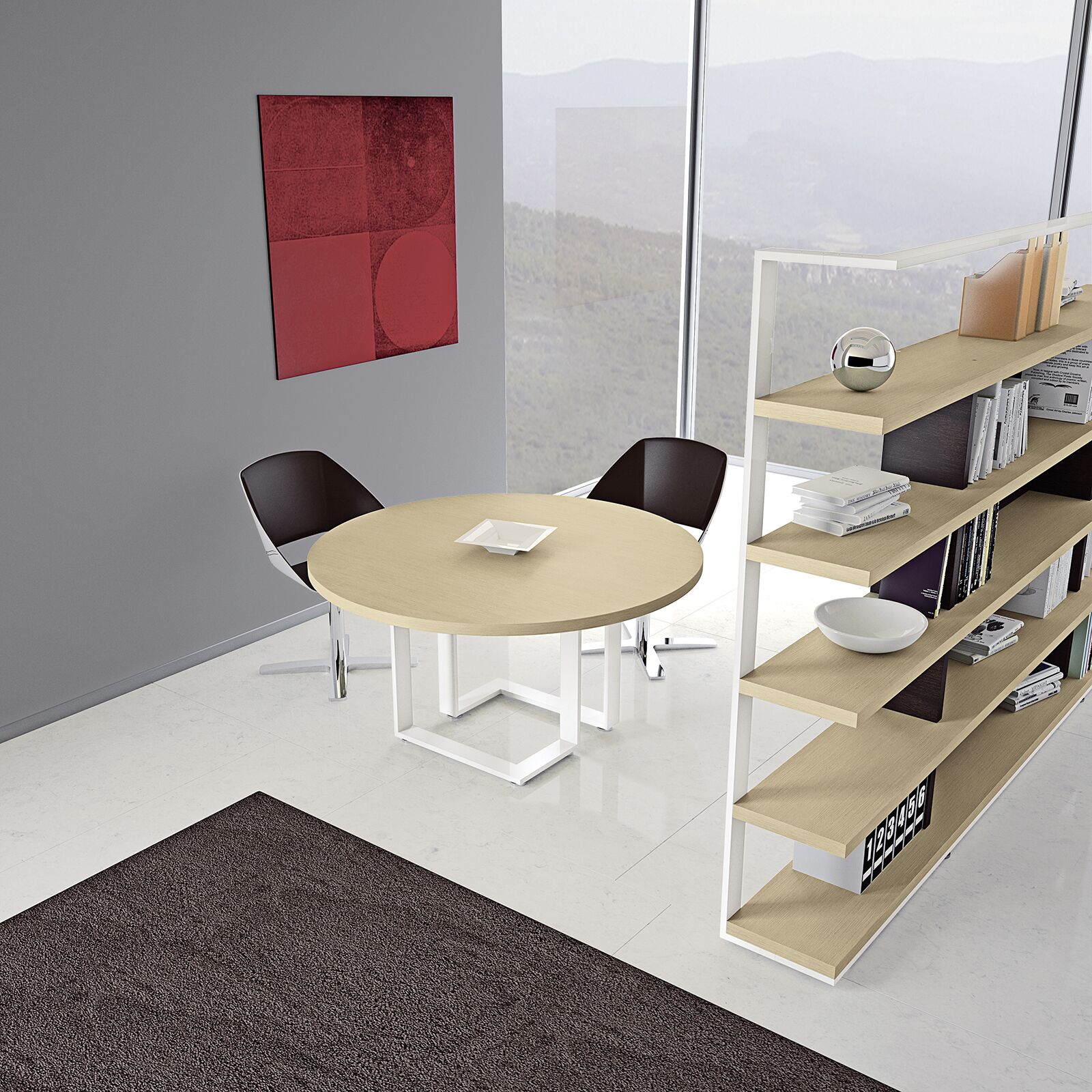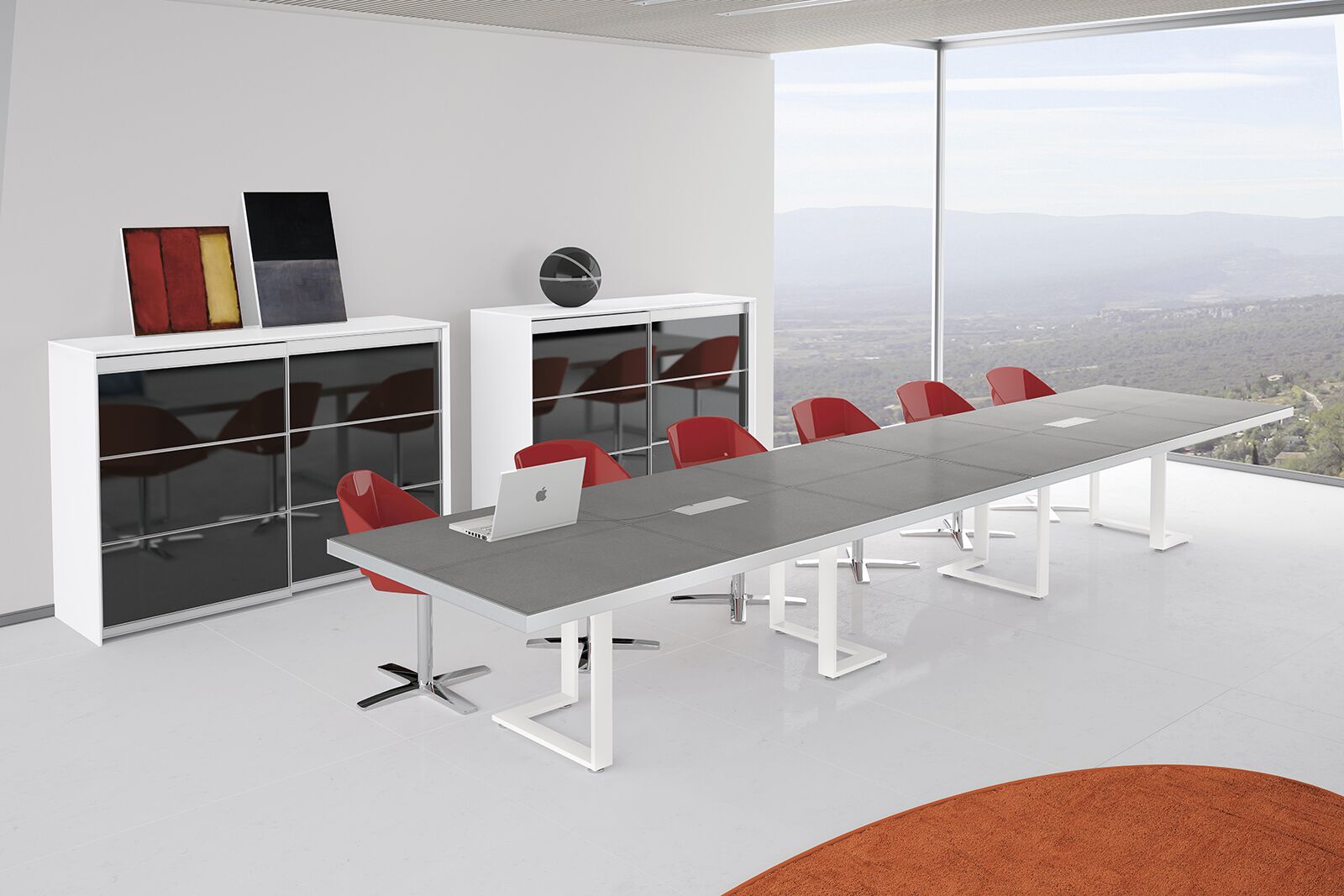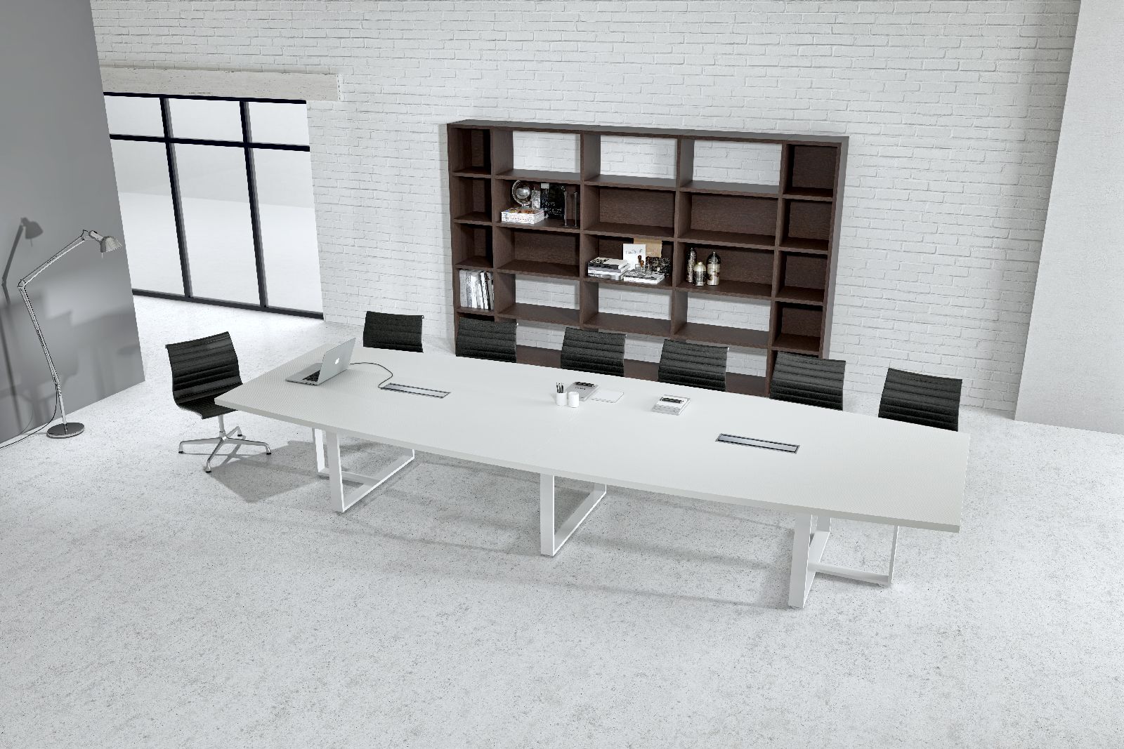 Archimede tables come in a variety of different sizes and shapes: rectangular, square, round, boat shaped. Flip top plug in is available for all tables and comes with a receiving trough for horizontal cable menagement. An ABS vertebra can be specified for the vertical wiring management. Archimede meeting table leg supports can come looped, 3 starred or straight angled (left or right).