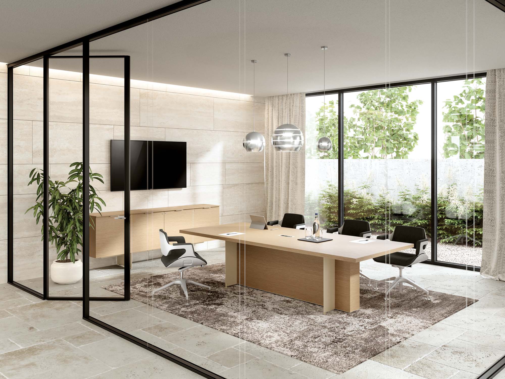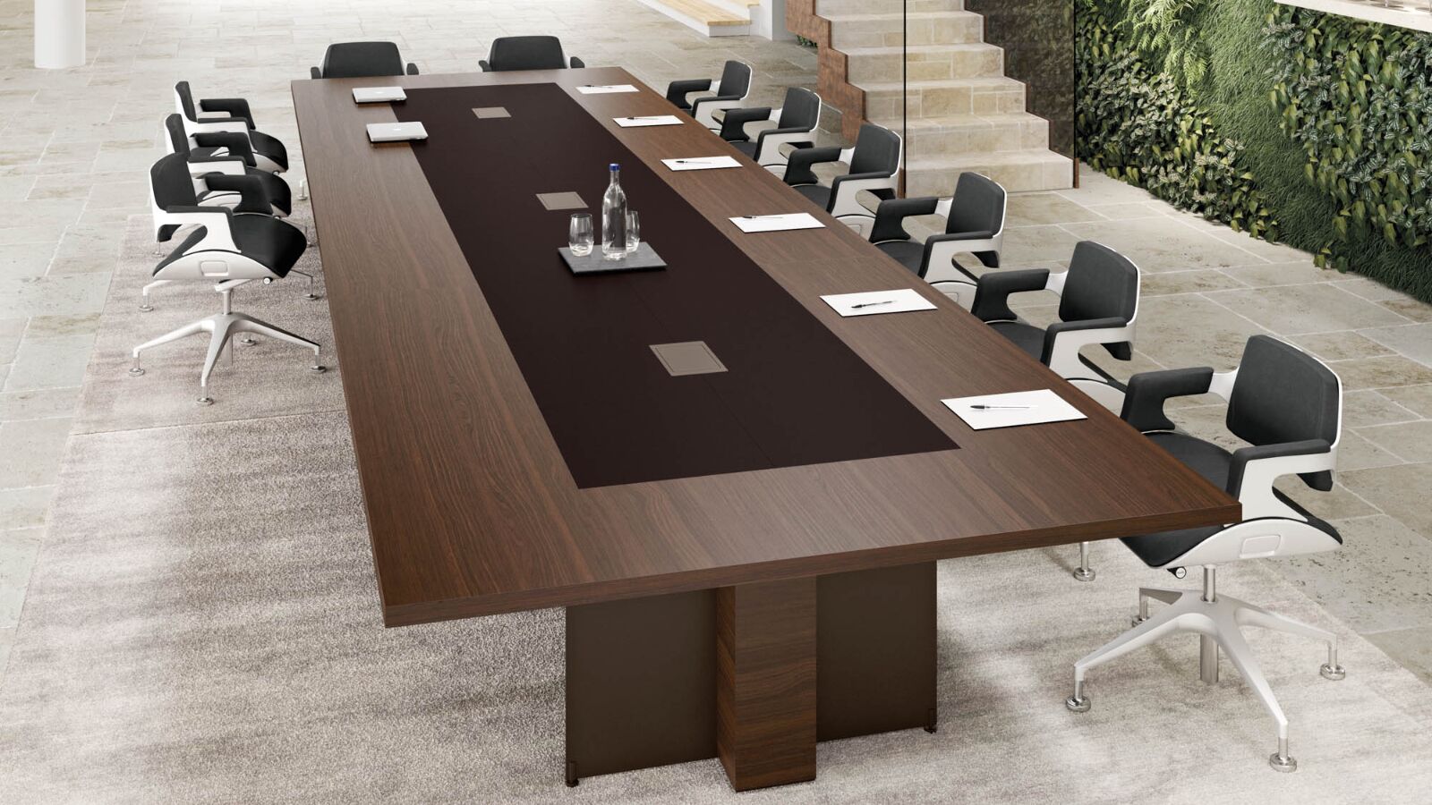 On Oasi meeting tables, the top is supported by 5/16″ thick metal legs specially drilled to allow the cables to pass from the folding to the central compartment between the two modesties. A modesty is structural and non-removable, the other is removable to allow access to the compartment where there is a basket holding the cables. A precious leather insert can be applied to modular meeting tables in wood veneer and with a depth of 1800 mm.