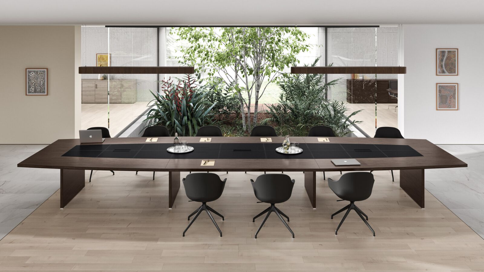 Odeon conferencing products come in a variety of shapes and sizes, boat shaped, square and round. Worksurface materials can be veneer, Italian melamine, backpainted glass or leather. Leg supports are paneled based, round or straight legs with vertical integrated wire managers. Odeon also supports side and coffee tables which are square or rectangular and come as panel based. Odeon in general, is a versatile executive line blending traditional and contemporary styles. The variety of desk models and finishes meets the aesthetic and functional needs of a broad clientele. Use of mix materials makes this a product suitable for all.