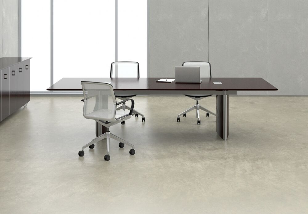 The Saber conference table uses thin geometries to give off a minimal aesthetic, while still maintaining full-service power and data options. The table comes standard with either concave or convex style bases, allowing it to easily harmonize with the style of the surrounding area.