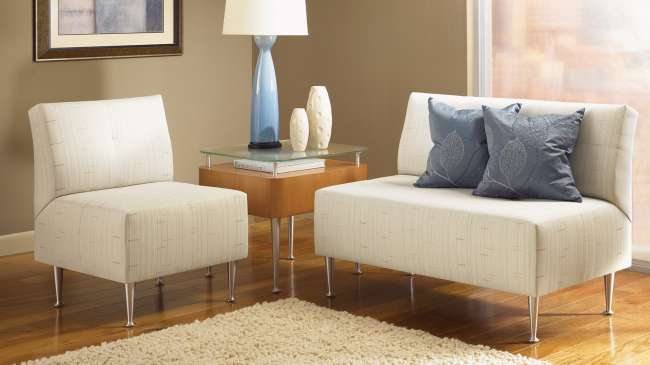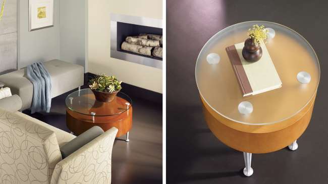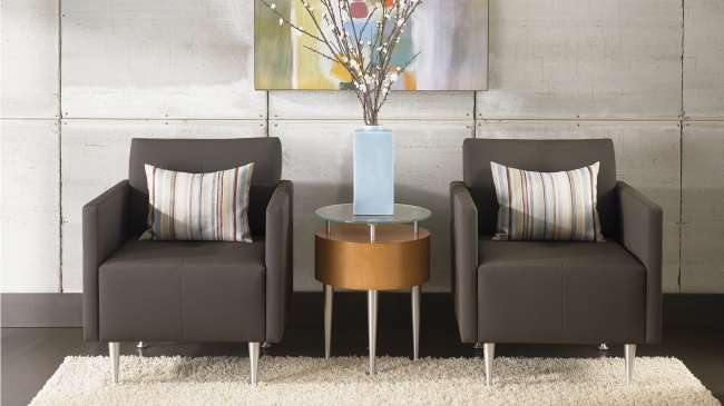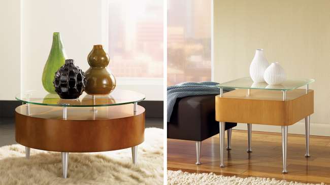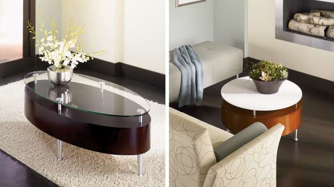 Fun, unique, functional and sophisticated! It all depends on how you mix and match a broad offering of wood finishes with anodized aluminum accents and a choice of top surfaces that include glass, frosted glass, wood veneer, laminate and solid surface materials. Available in square and round end tables as well as round and oval cocktail tables, the unique look of the Retrospect occasional tables blends seamlessly with a full offering of Retrospect lounge seating.