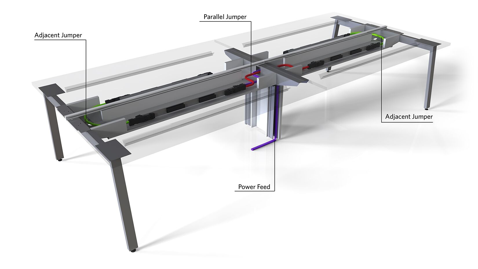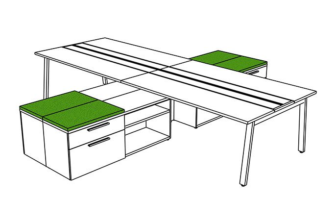 Elegant Design Lines – smooth surfaces, seamless appearance. From bench/tables to complete open office layout options. Steel reinforced worksurface, structure and legs & simple component assembly. Center support designed to reduce number of legs on large table configurations leaving options open for seating arrangements, capacity and lateral movement. Each recessed leg has dual-cable access to the floor. Numerous cabinet integration options – mobile, fixed, stacked and elevated along with return options, end-counters and bins. Proprietary designed, brushed aluminum, easy access, stay-open surface lids. Fully equipped power/data or value-engineered open-trough options. Two duplex power access + 4X data per table side. High capacity, low profile, encased undersurface cable trays.