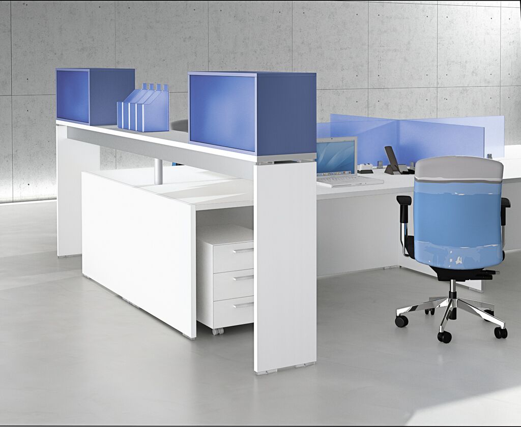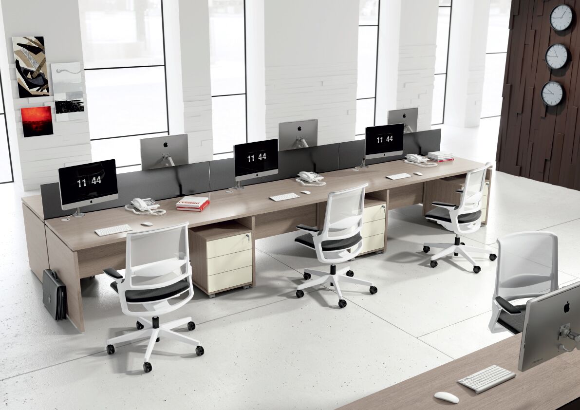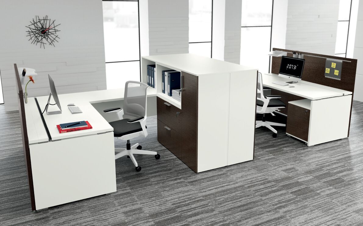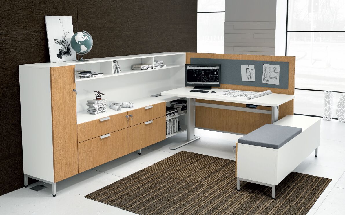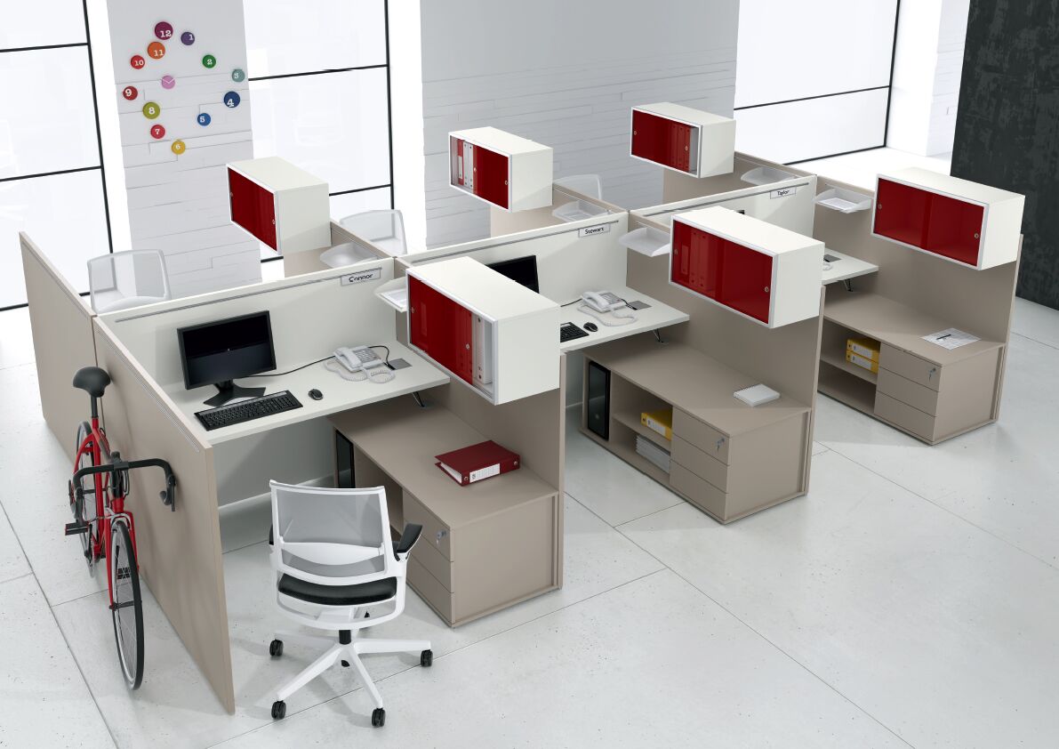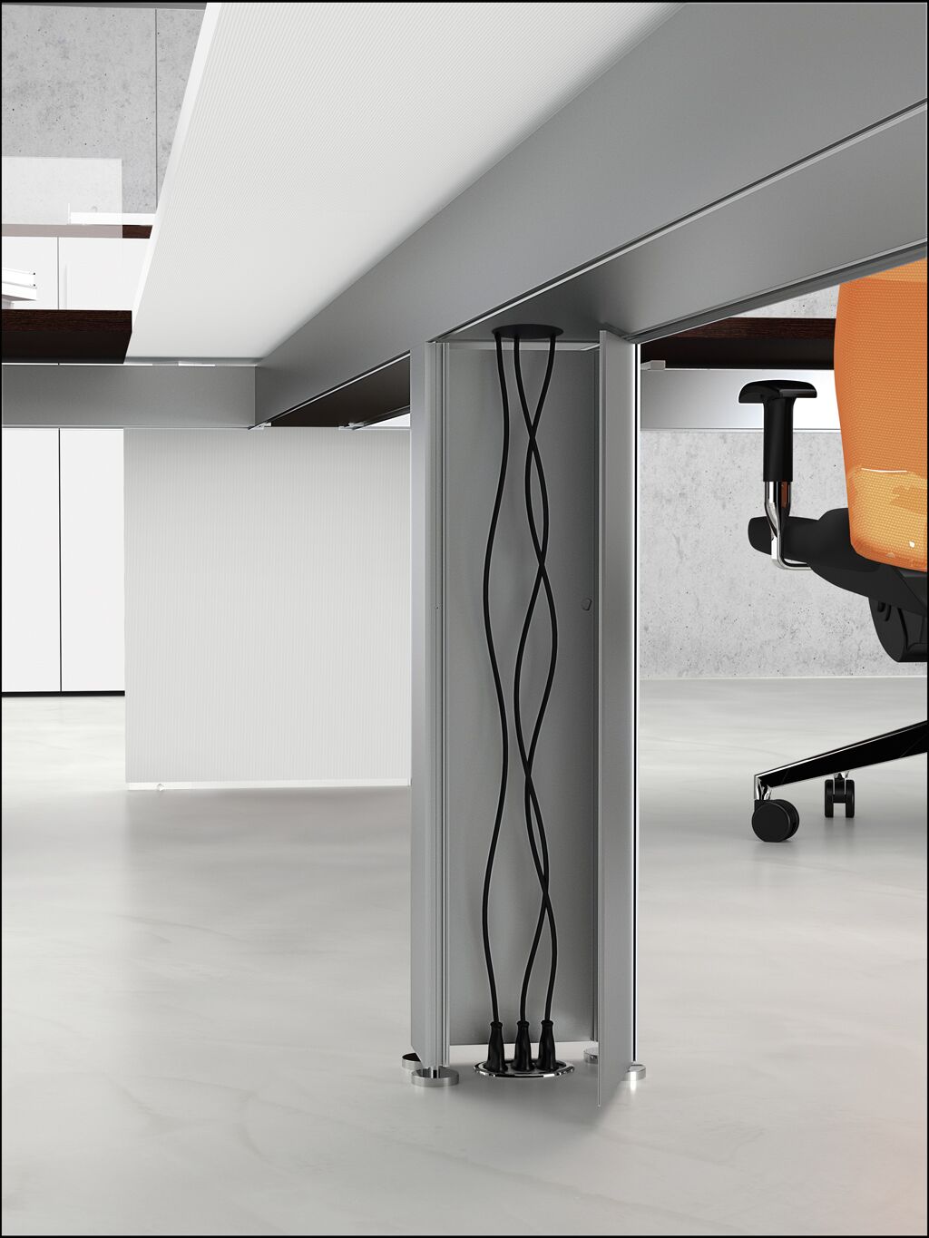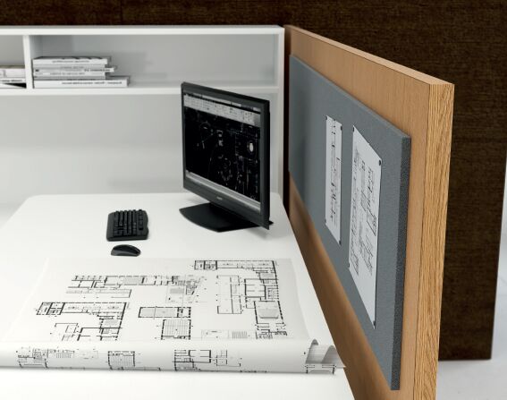 Atlante can be easily customized using several finish combinations. Every element can have a different color. Panel based Atlante features standing height work ports, open, shared or closed storage units, raised and floating shelves to help keep the full work surface free from clutter. Soft close wire management and vertical wire managers supports and enables creative work flows. Slim work stations in mixed colors eliminate “panel creep” while creating adequate space per each user. Seated height visual privacy screens in a variety of mixed materials make for an interesting landscape.
