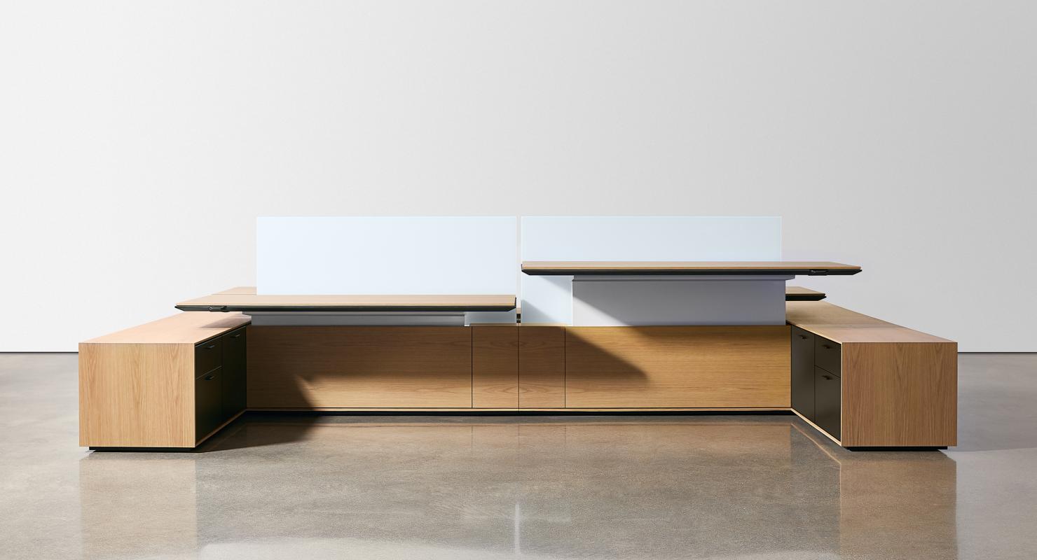The Halo line of case goods can be rearranged to cater to any sort of office setting, including an open floor plan office design.