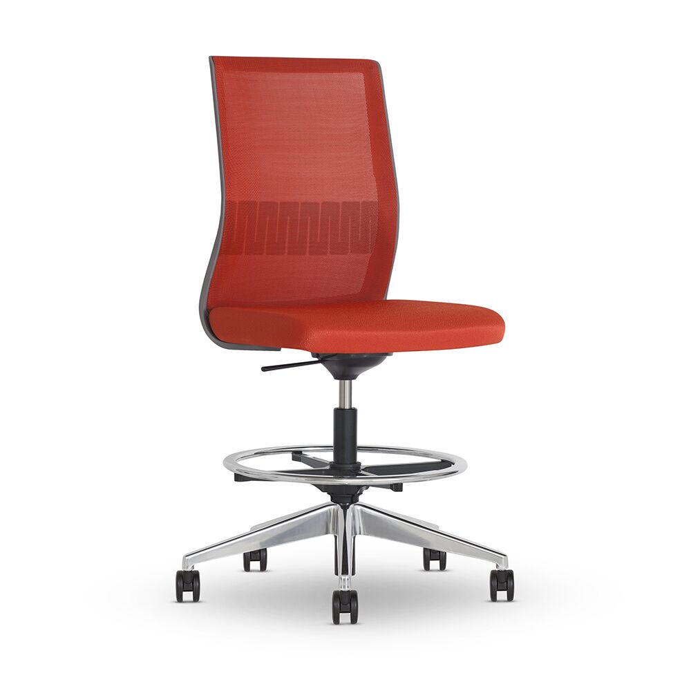 Available as conference chair, task chair and stool, 6C models are offered in low-back and mid-back. Arm options include loop arms and adjustable arms. It is also available armless. The mesh back and knit seat can be selected in one of nine color choices and two colors are available for the nylon arm supports. The base is available in nylon (two colors) or polished aluminum.