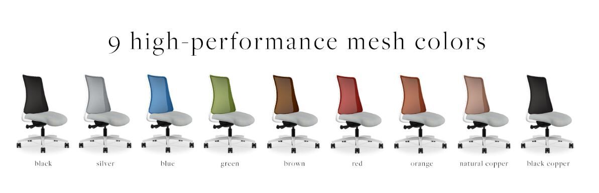 Mesh: in addition to 7 designer standard 4 way elastomeric mesh, now featuring two biocidal, first-to-market, patent-pending Genie Copper Mesh® in copper and black colors perfect for healthcare environments as well as improving hygiene in shared desk situations.