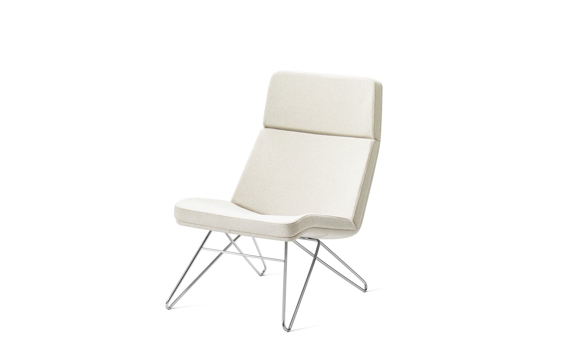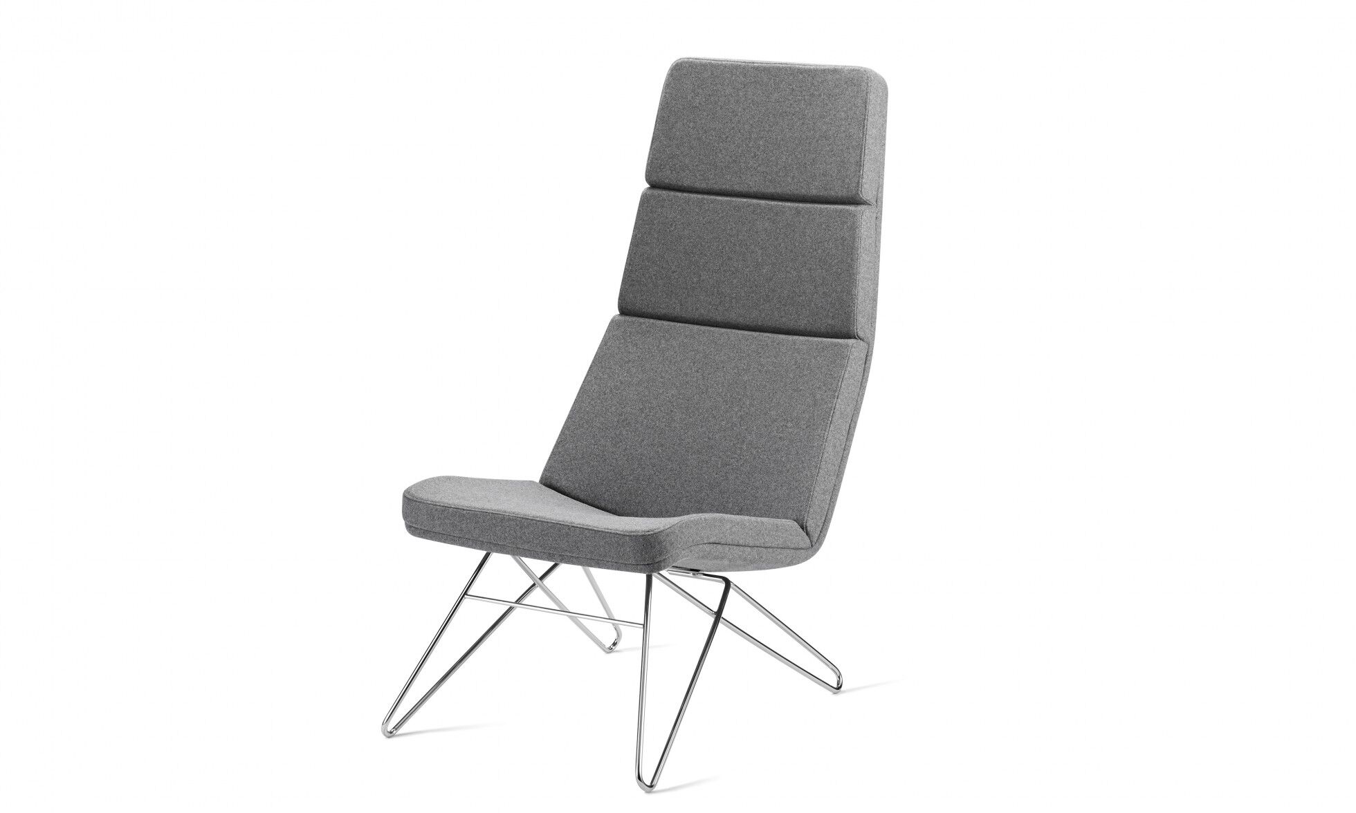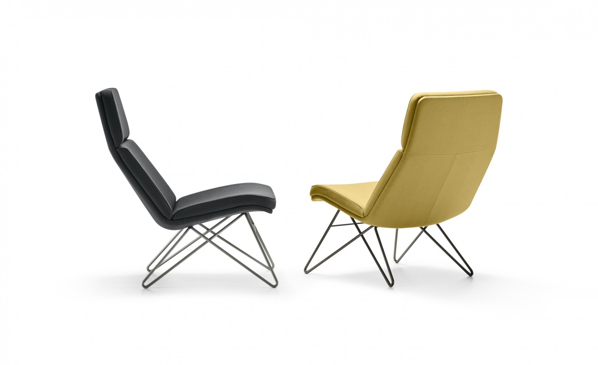 Crisscross wire base in chrome, soft chrome, white, black matte, light bronze, medium bronze, dark bronze, gunmetal, brass, raw on chair and lounge