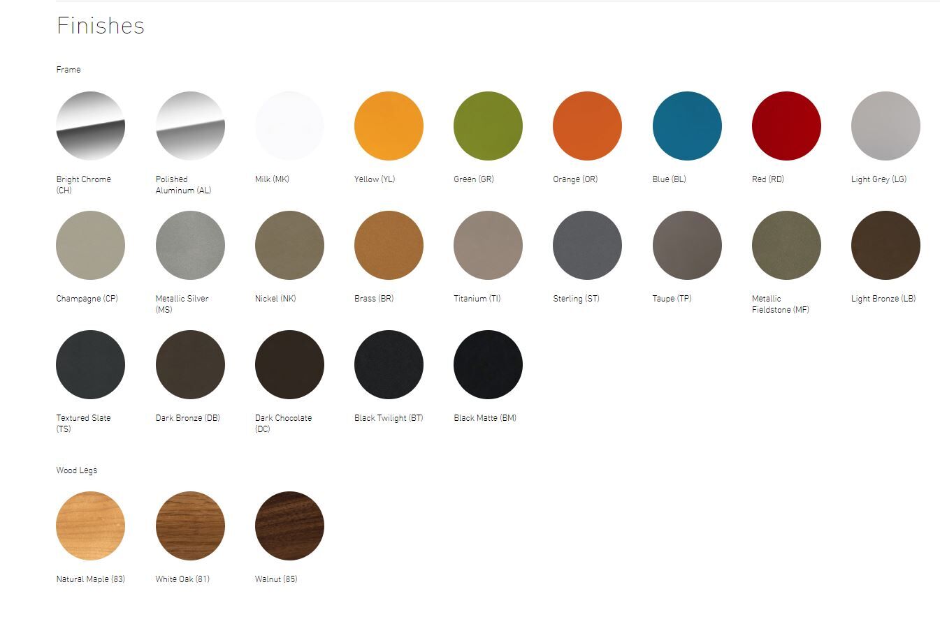 Base Finishes – Polished aluminum (four and five-blade models), powder coated (all models except five-blade), satin and polished chrome (sled base models), wood finish (4-leg wood base).