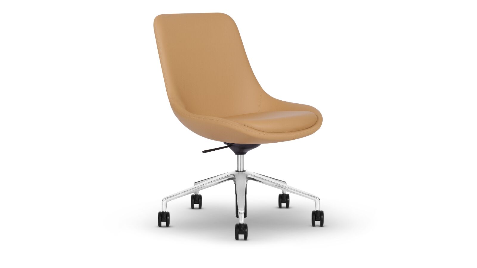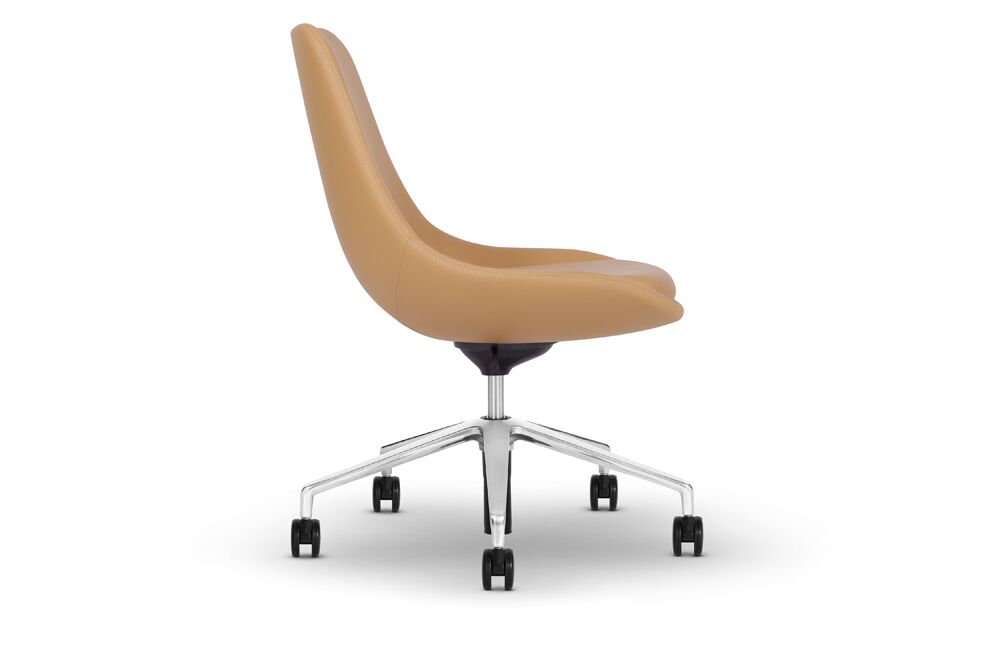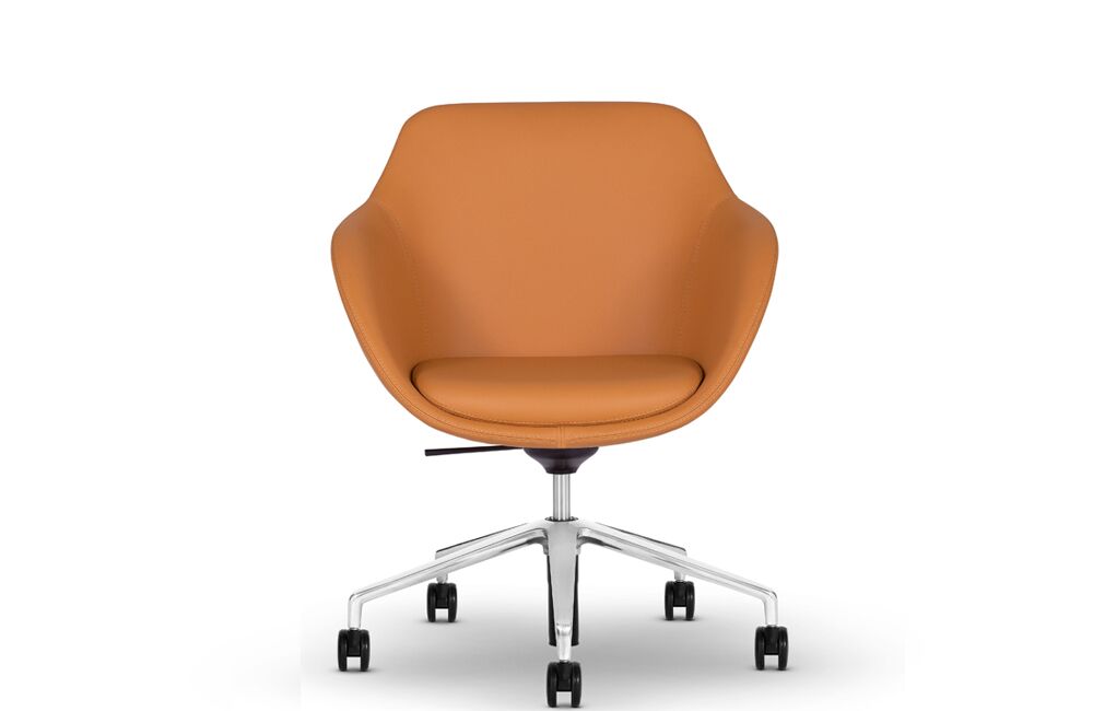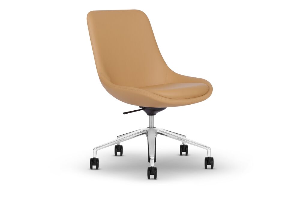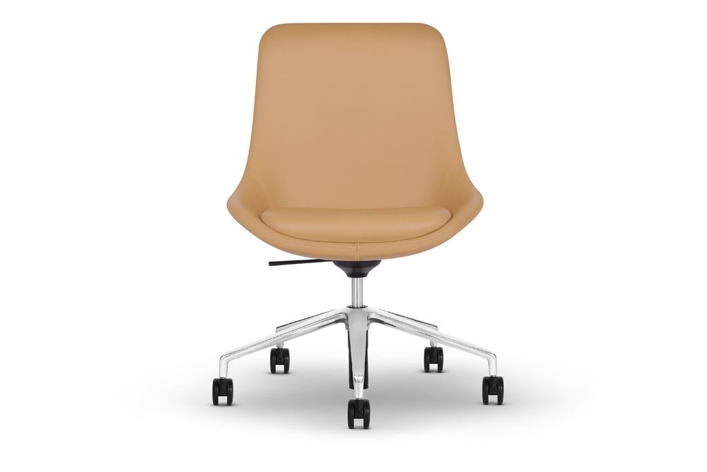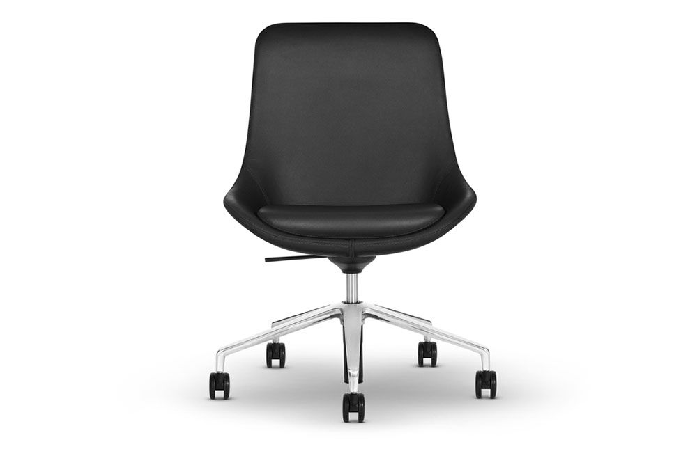Ponder lounge chairs are available in high, mid and low back with three optional bases: sled, 4-leg wood, and 4-star. A complementing ottoman is available on a sled base.