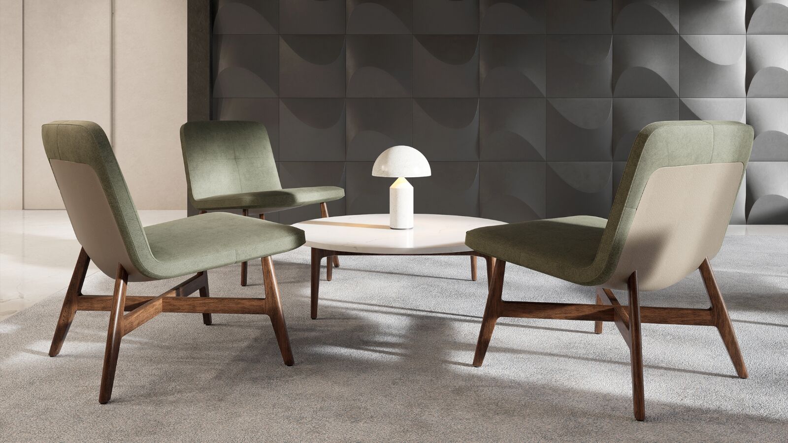 An exploration of minimalism and lightness, the lounge chair of the Swav family features a refined-yet-simple wooden base and an accommodating seat with premium details such as a single grid stitch and a sumptuous combination of textiles.