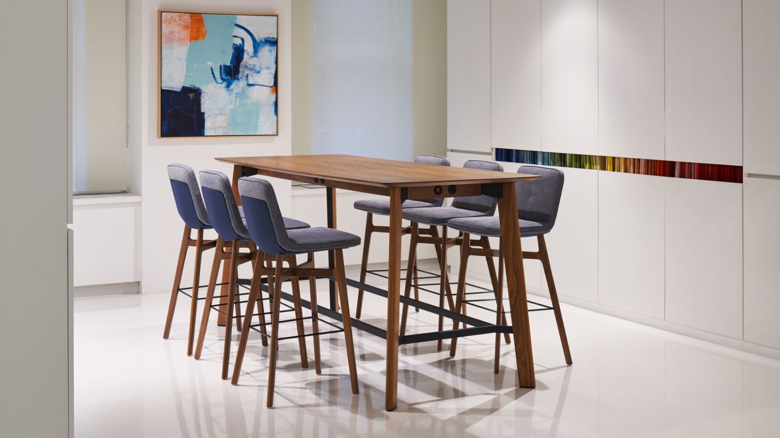 Swav counter and bar stools are extensions of the armless lounge chair. The back of these stools feature the same framed detail as the mid-back conference chair, and a similar wood structure as the armless lounge chair.